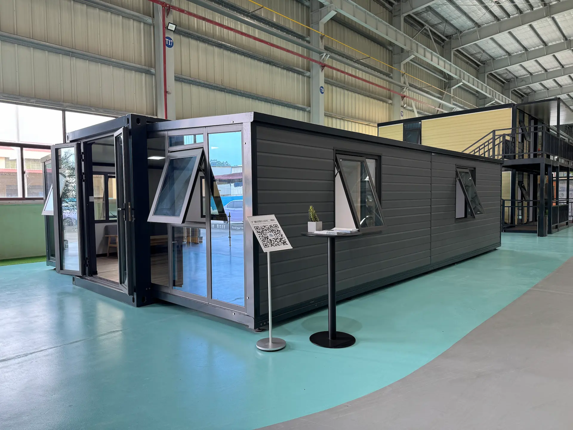 Expandable container houses uses a high-strength galvanized steel frame as its supporting structure, ensuring stability and safety of the overall construction. The exterior is covered with eco-friendly composite panels, which are lightweight while providing excellent thermal insulation, heat resistance, and soundproofing. Quick unfolding and folding allow for easy space expansion and repeated use.